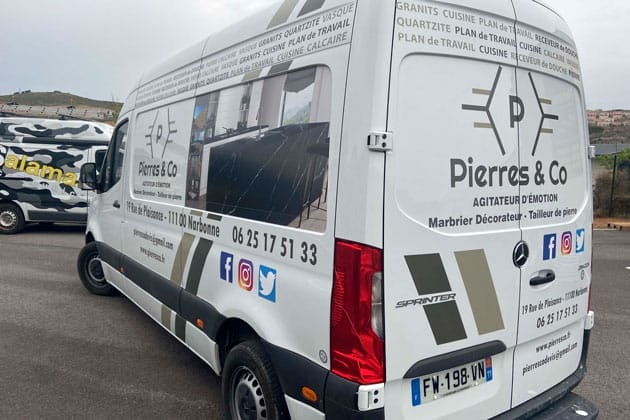 Décoration en lettres semi-découpées et impression numérique sur 2 côtés du véhicule. Ce flocage reste à la fois visible tout en conservant une certaine discrétion au quotidien.